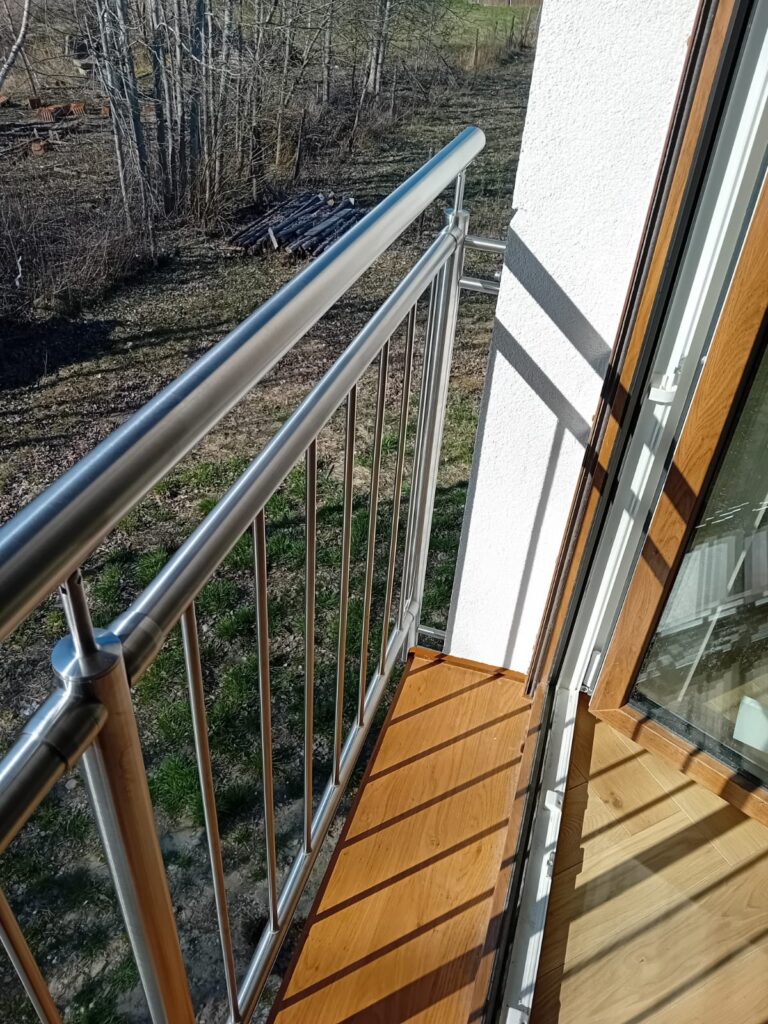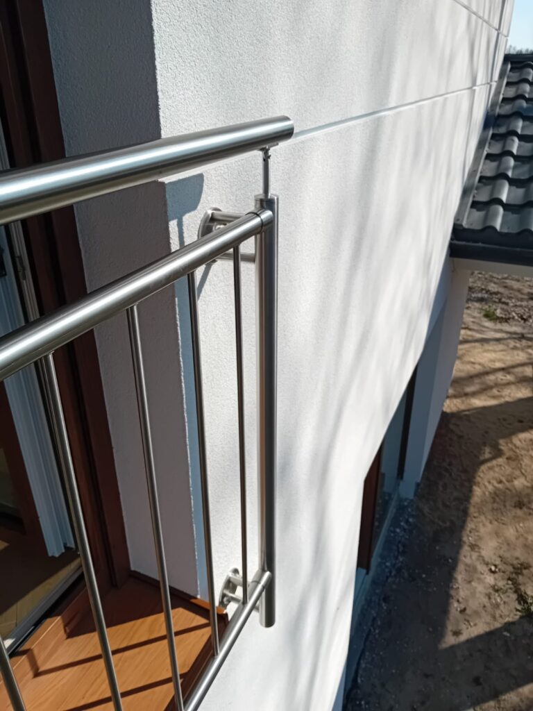 W tej realizacji postawiliśmy na stal nierdzewną szlifowaną, która świetnie komponuje się z nowoczesną elewacją oraz drewnianą stolarką okienną.