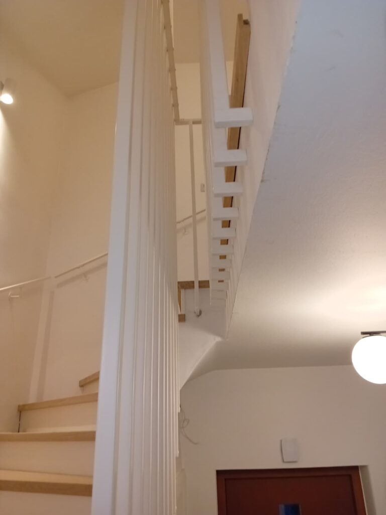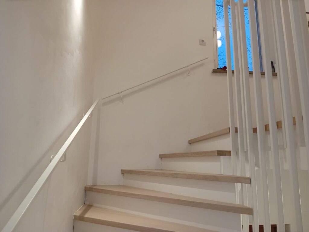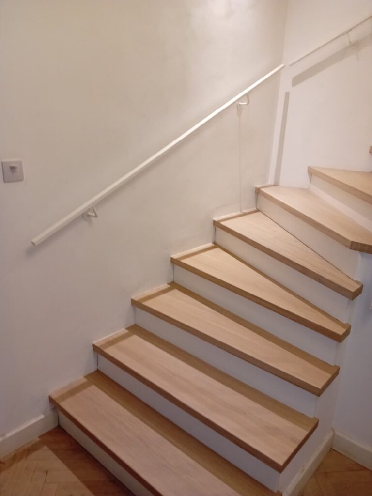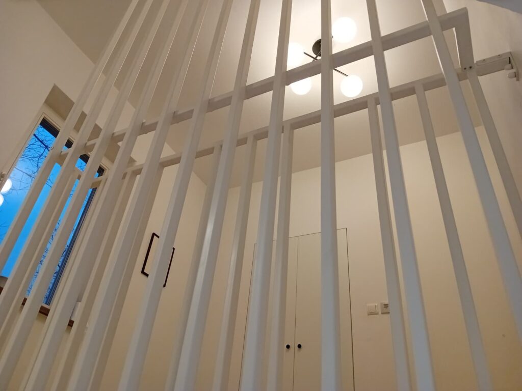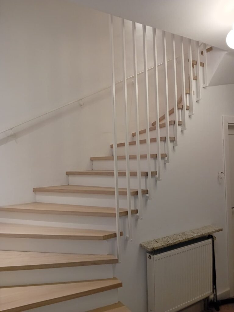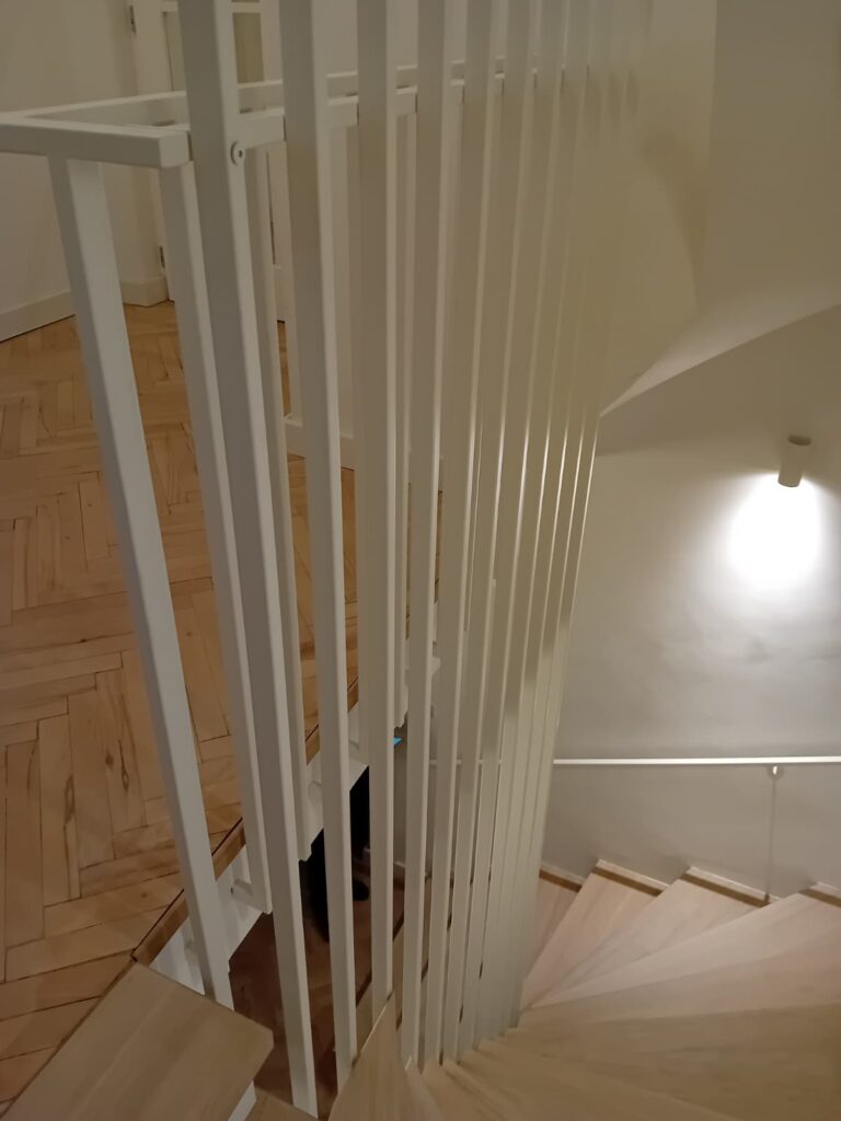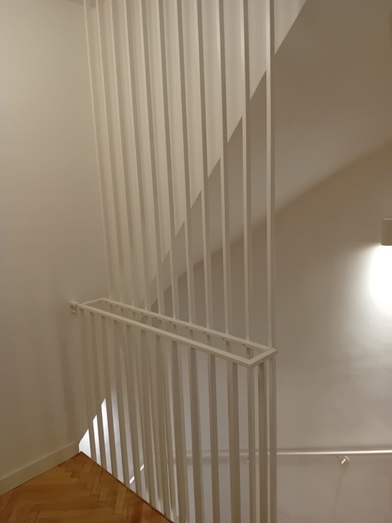 Delikatna forma i prosta linia konstrukcji świetnie wpisują się w estetykę nowoczesnego wnętrza. Całość wykonana ze stali i malowana proszkowo, co zapewnia trwałość i eleganckie wykończenie. Do kompletu zamontowaliśmy także dopasowaną poręcz ścienną – wszystko dla bezpieczeństwa i komfortu użytkowników 💡